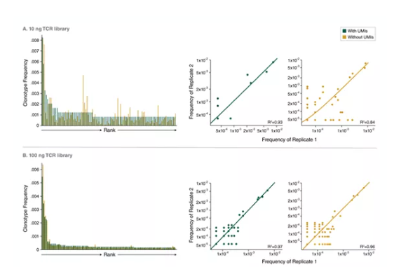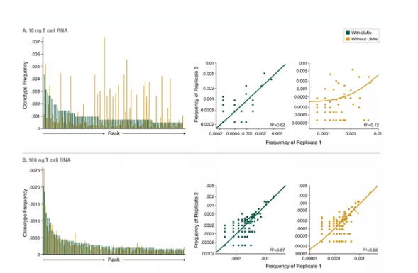 使用唯一分子標(biāo)簽序列(UMI)實(shí)現(xiàn)克隆型的精準(zhǔn)檢測(cè)。在有或沒有 UMI 情況下,比較小鼠 TCR 克隆型頻率。根據(jù)有 UMI 的測(cè)序結(jié)果,對(duì)前 100 個(gè)高表達(dá)克隆型進(jìn)行排序。在有或沒有 UMI 情況下,重復(fù)建庫,克隆型頻率重疊繪制于圖中。每個(gè)條形或圓點(diǎn)代表一個(gè)克隆,該克隆經(jīng)過總讀長(zhǎng)分析或使用 UMI 過濾。使用 UMI 可對(duì)原始樣本中的起始 RNA 分子進(jìn)行絕對(duì)定量。當(dāng)將克隆按照富集度從高到底進(jìn)行排序,沒有 UMI 的數(shù)據(jù)會(huì)導(dǎo)致 PCR 或測(cè)序擴(kuò)增的偏差,從而誤導(dǎo)樣本中克隆型頻率的分析。UMI 的使用通過對(duì)起始樣本中 RNA 的絕對(duì)定量來校正偏差。使用 UMI 也可以在重復(fù)本之間實(shí)現(xiàn)更好的相關(guān)性,尤其是起始量較低時(shí)。各個(gè)文庫向下抽樣 500,000 reads。