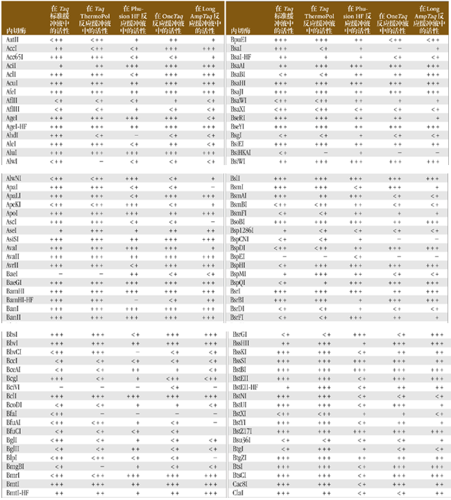 通常,PCR 反應(yīng)后還要對(duì)產(chǎn)物進(jìn)行酶切才能進(jìn)行下一步工作。為了方便起見(jiàn),可以將內(nèi)切酶直接加到 PCR 反應(yīng)產(chǎn)物中,而省略純化 PCR 產(chǎn)物的步驟。下表歸納了在 Taq、Phusion*、OneTaq 和 LongAmpTaq PCR 產(chǎn)物混合物中各種限制性內(nèi)切酶的酶切活性。50 μl 反應(yīng)體系中,將 5 單位內(nèi)切酶加入到 PCR 反應(yīng)產(chǎn)物中,在適當(dāng)?shù)臏囟认路磻?yīng) 1 小時(shí),凝膠電泳分析酶活性。PCR 反應(yīng)產(chǎn)物中包括:1X ThermoPol 反應(yīng)緩沖液、標(biāo)準(zhǔn) Taq 反應(yīng)緩沖液、Phusion HF 反應(yīng)緩沖液、OneTaq 標(biāo)準(zhǔn)反應(yīng)緩沖液或 LongAmpTaq 反應(yīng)緩沖液,含 dNTPs(終濃度為 200 μM)、1 μg DNA 和 1 單位 Taq DNA 聚合酶。