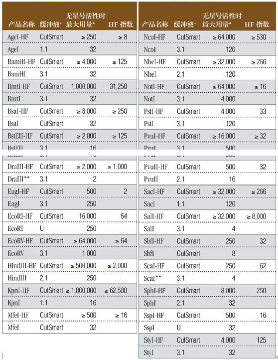 下表為 HF 內(nèi)切酶和其野生型在檢測(cè)到明顯星號(hào)活性前的最大酶用量。HF 指數(shù)代表在選擇 HF 內(nèi)切酶時(shí)酶用量增加的倍數(shù),數(shù)據(jù)清楚顯示了 HF 內(nèi)切酶帶來的靈活性。