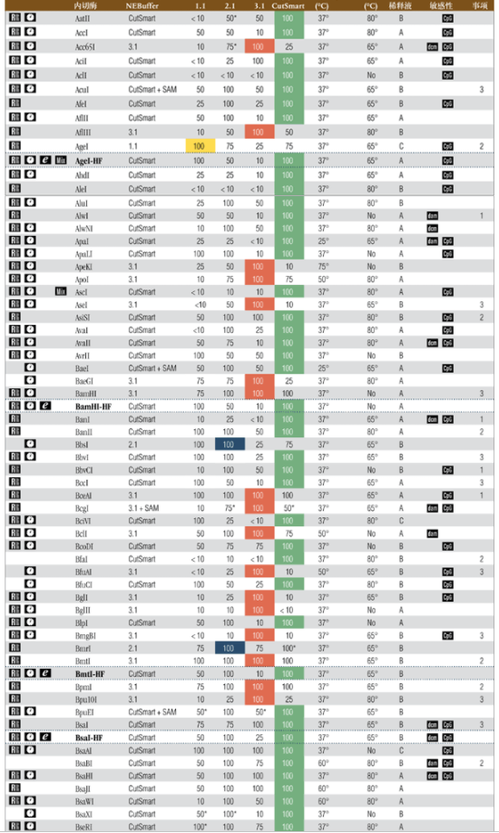 注:表中數(shù)值為近似值,所用底物與內(nèi)切酶定義中的底物相同,更新的內(nèi)容請(qǐng)查閱 www.neb-china.com 及